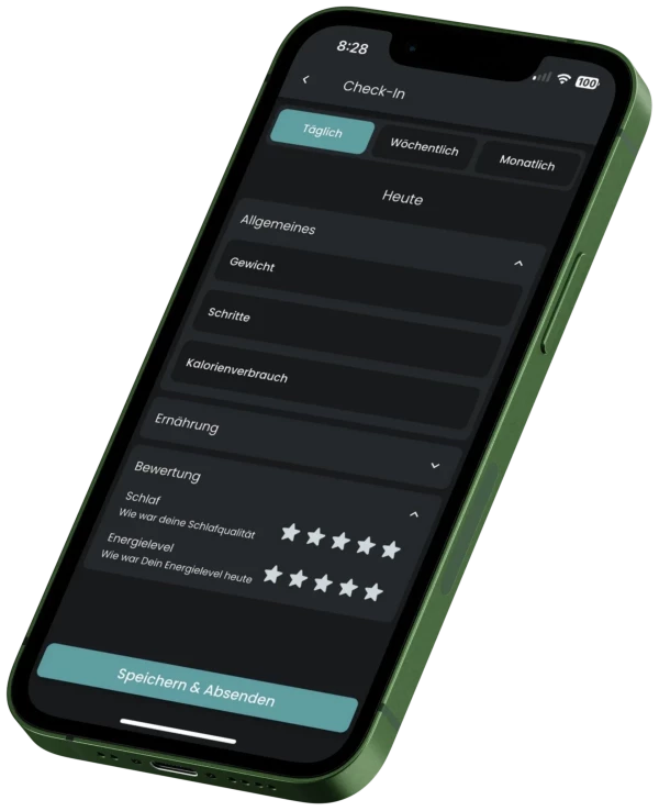 Wir tracken Gewichtsverlauf, Schlafrhythmus, Schritte und Stress. Tägliches Feedback ermöglicht sofortige Anpassungen für maximalen Fortschritt.