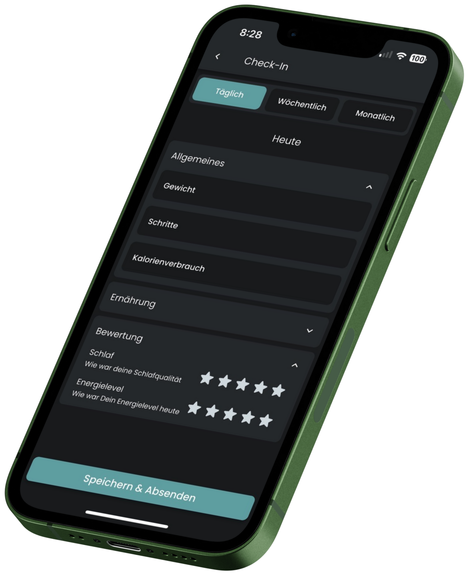 Durch die tägliche Eingabe Deines Gewichts, Deiner Schritte und anderer Daten, können wir Deinen Fortschritt genauestens dokumentieren.