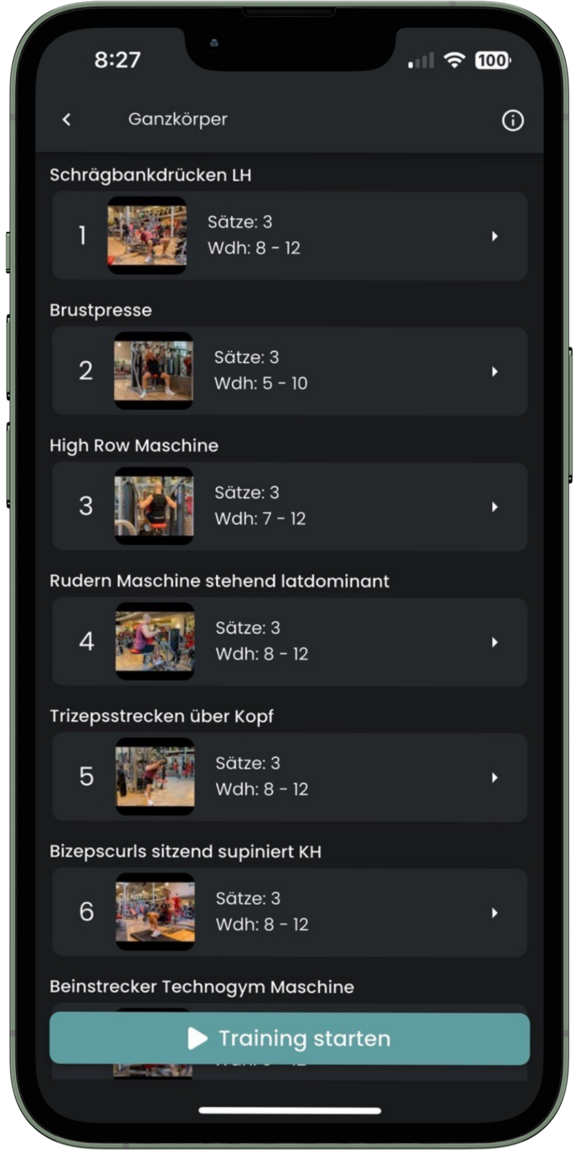 Zu jeder Übung erhält Du eine genaue Anleitung inkl. Anleitungsvideo, Satzvorgaben und Gewichtsvorgaben.